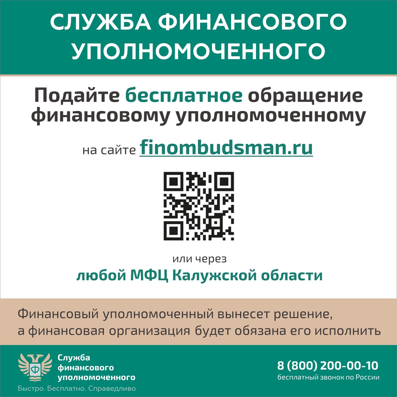 Если спор с финансовой организацией НЕ урегулирован – подайте обращение финансовому уполномоченному на его официальном сайте finombudsman.ru или через любой МФЦ Калужской области.
