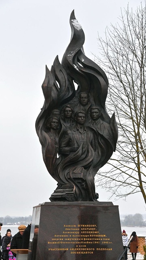 5 декабря в Людинове, городе воинской доблести и трудовой славы, был открыт памятник Героям Людиновского подполья: Алексею Шумавцову, Анатолию Апатьеву, Александру Лясоцкому, Антонине и Александре Хотеевым, зверски замученным фашистами в годы Великой Отечественной войны, и всем участникам Людиновского подполья.