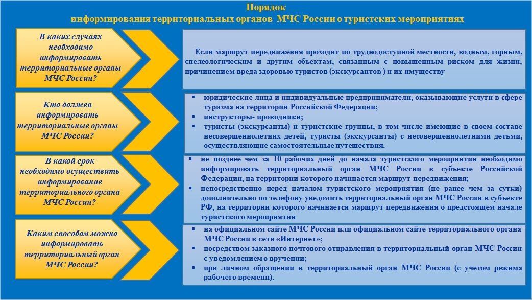В соответствии с постановлением Правительства Российской Федерации от 03.03.2017 № 252 «О некоторых вопросах обеспечения безопасности туризма в Российской Федерации» организациям и индивидуальным предпринимателям, оказывающим услуги в сфере туризма на территории Российской Федерации, туристам и туристским группам, в том числе имеющим в своем составе несовершеннолетних детей, а также туристам с несовершеннолетними детьми, осуществляющим путешествия по туристским маршрутам на территории Российской Федерации, требующим сопровождения инструктором-проводником, необходимо перед выходом на такие маршруты в установленном порядке информировать территориальный орган МЧС России по соответствующему субъекту Российской Федерации о выходе на такие маршруты.