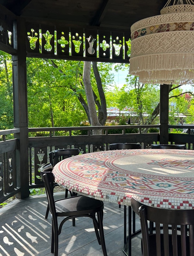 Творческая лаборатория организована в саду в беседке, которая является безупречным примером интеграции художественных промыслов и ремесел в дизайн пространства. Здесь можно увидеть и традиционную для Тарусы резьбу по дереву, и абажур в технике макраме, украшенный Тарусской вышивкой, и стол, украшенный мозаикой, выложенной по мотивам Тарусской вышивки художниками-мозаичистами компании «МЭЙД» по экскизам дизайнера Евгении Ждановой.