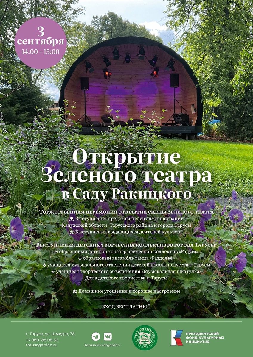 3 сентября в 14:00 состоится торжественное открытие сцены Зеленого театра в саду Ракицкого. Событие станет новым этапом в реализации долгосрочного проекта по возрождению усадьбы советского агронома в Тарусе. Вход свободный.